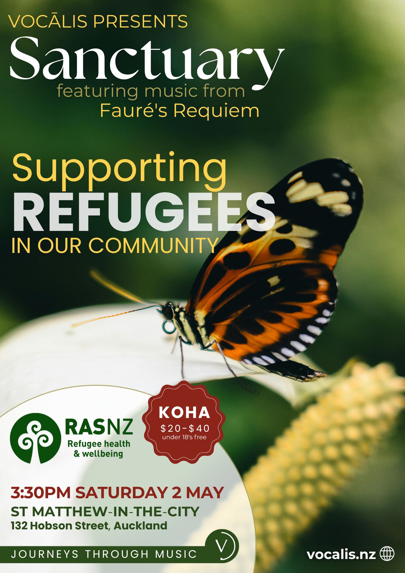 A koha will be collected at the door to help cover the costs of this concert as well for their annual fundraising concert at St Matthew in the City, Auckland, for Refugees as Survivors NZ